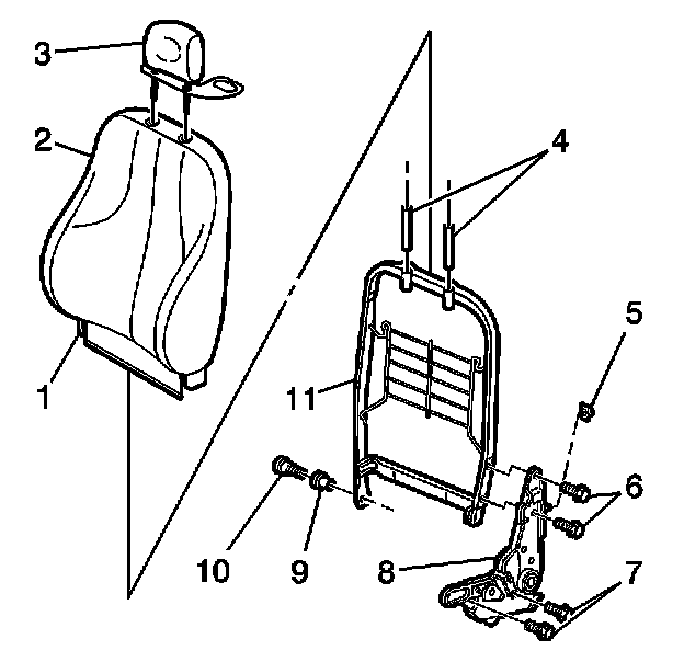 1. Pull the bottom of the seat back cover assembly (2) down and over the frame (11).