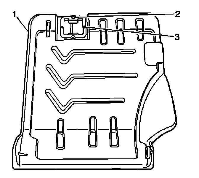 2. Install the rivets (2) to the latch striker (3). Use a rivet gun to attach the latch striker (3) to the seat back frame (1).