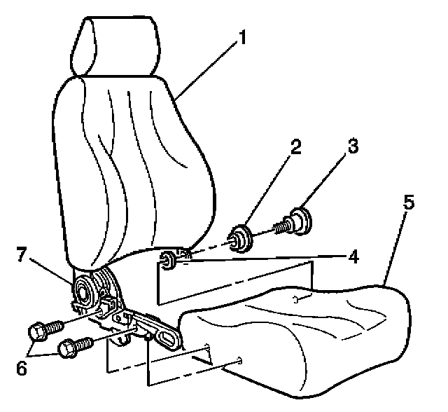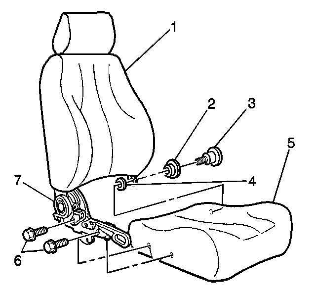 10. Remove the front bucket seat back (1) from the front seat cushion (5).