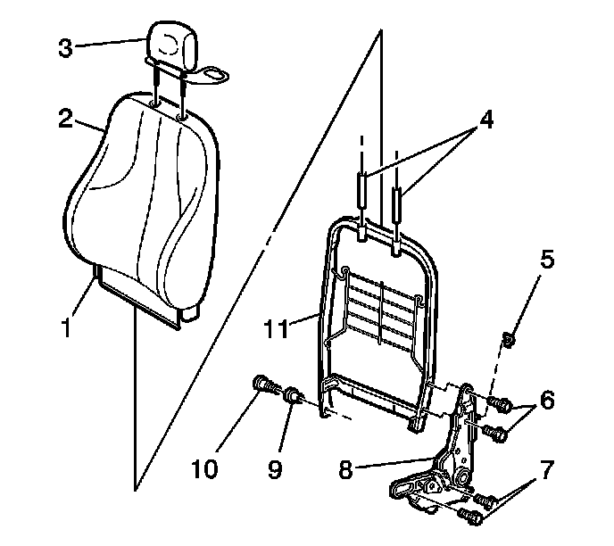 1. Pull the bottom of the seat back cover assembly (2) down and over the frame (11).