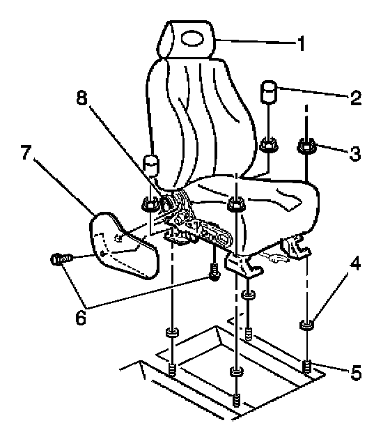 2. Position the front bucket seat forward or rearward in order to gain access to the seat adjuster nuts (3).