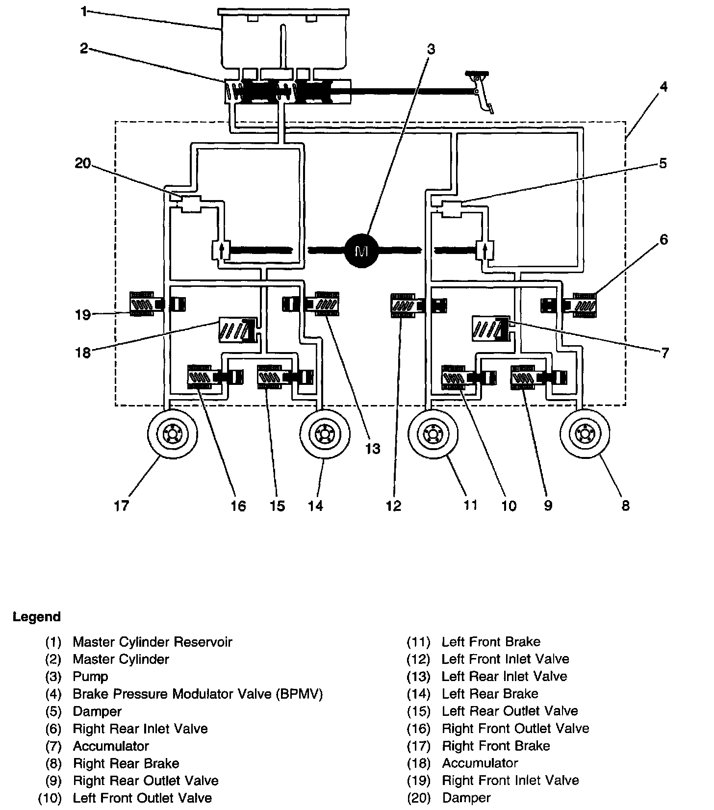 ^ Brake Pressure Modulator Valve (BPMV) - The BPMV contains the hydraulic valves and pump motor that are controlled electrically by the EBCM. The BPMV uses a 4 circuit configuration with a diagonal split. The BPMV directs fluid frown the reservoir of the master cylinder to the left front and right rear wheels and fluid from the other reservoir to the right front and left rear wheels. The diagonal circuits are hydraulically isolated so that a leak or malfunction in one circuit will allow continued braking ability on the other.