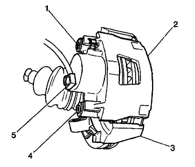 Notice: Support the brake caliper with heavy mechanic's wire, or equivalent, whenever it is separated from it's mount and the hydraulic flexible brake hose is still connected. Failure to support the caliper in this manner will cause the flexible brake hose to bear the weight of the caliper, which may cause damage to the brake hose and in turn may cause a brake fluid leak.