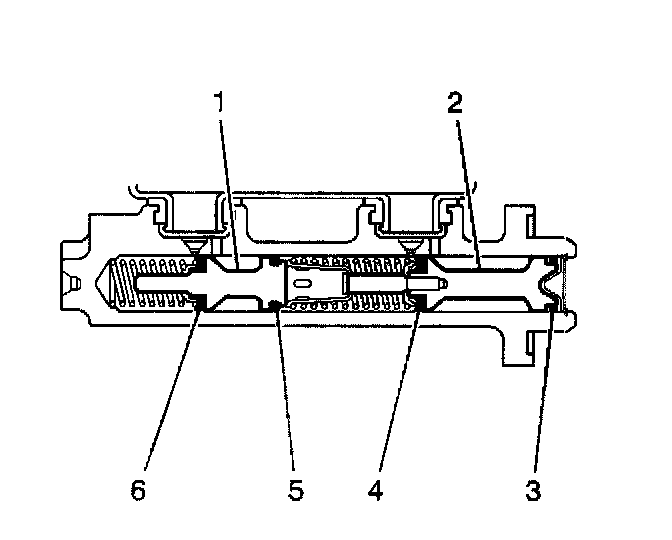 2. Inspect the master cylinder bore, inlet and outlet ports, the secondary piston (1), and the return spring for cracks, scoring, pitting, and/or corrosion. Replace the master cylinder if any of these conditions exist.