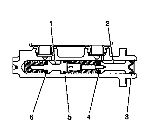 9. Plug the cylinder inlet ports and the rear outlet port. Apply low pressure, non-lubricated, filtered air into the front outlet port, in order the remove the secondary piston (1) with the primary (6) and secondary (5) seals, and the return spring.