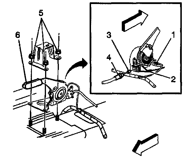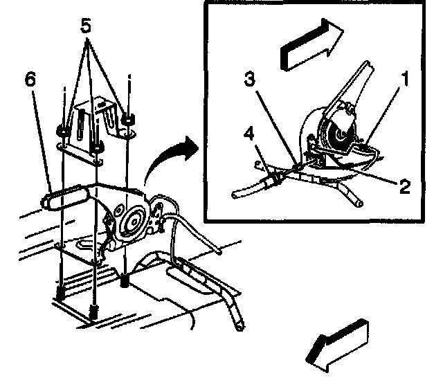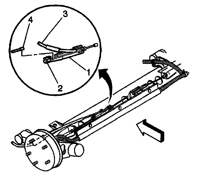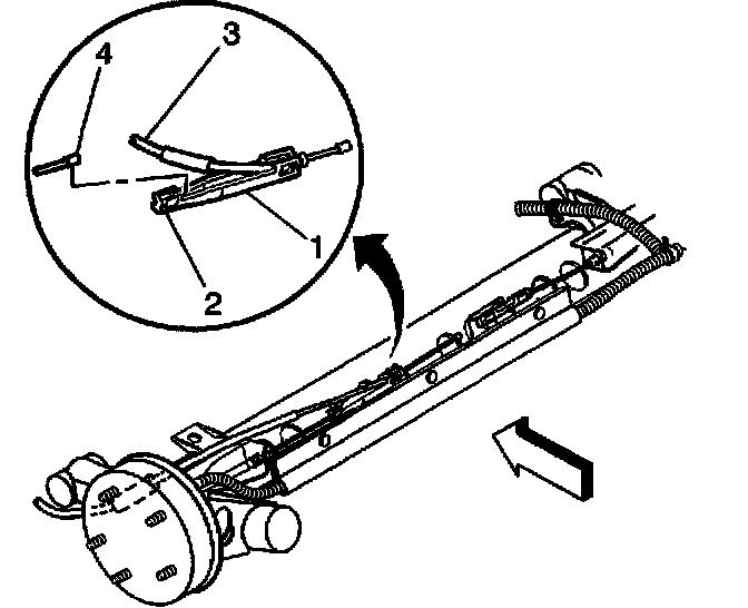 7. Disconnect the front cable (3) conduit end fitting from the cable equalizer (1).