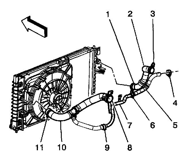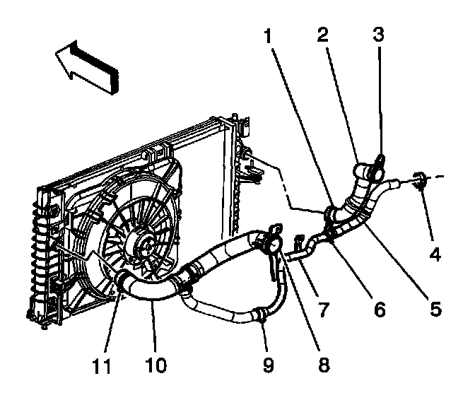 9. Install the radiator outlet hose (6) to the radiator.