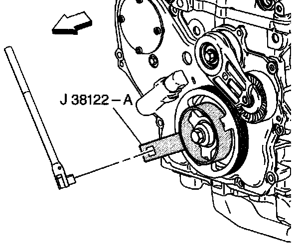 5. Use J 38122-A to prevent the crankshaft from rotating while loosening the crankshaft balancer bolt.