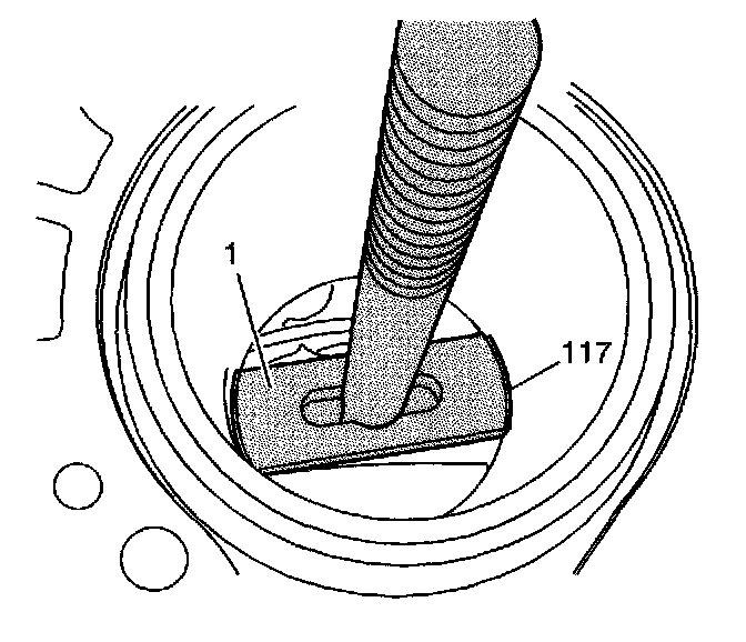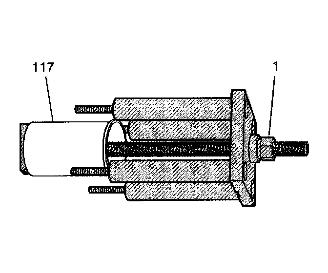 3. Align the shoe (1) of the cylinder bore sleeve puller EN 45680-402 to the bottom of the cylinder bore sleeve (117).
