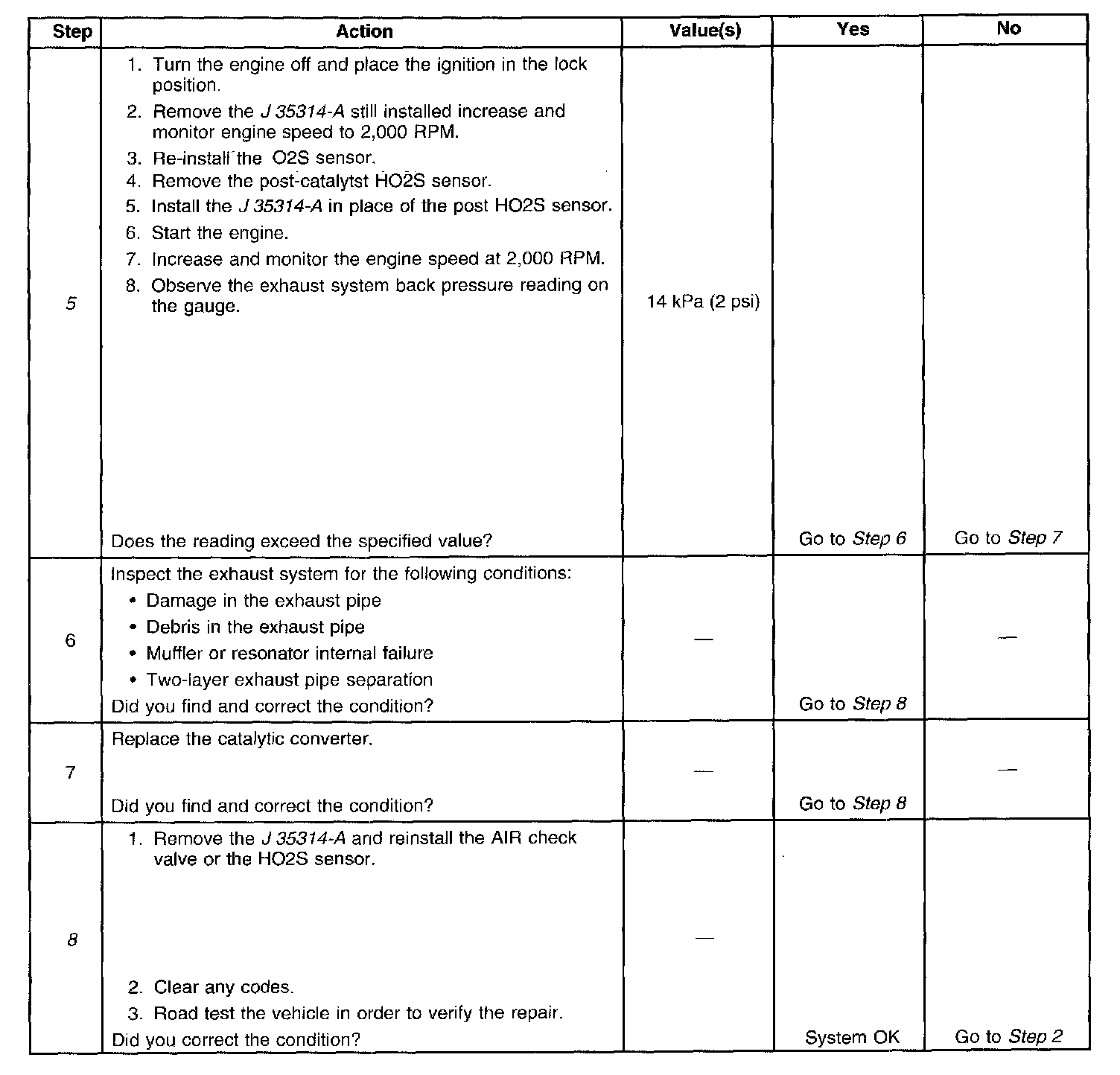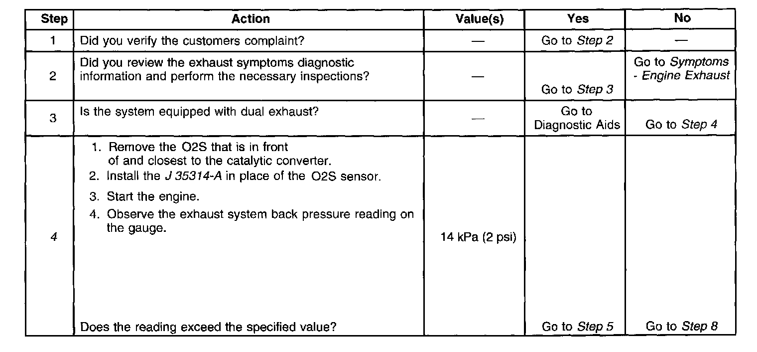 4. The exhaust system has very low back pressure under normal conditions. If the exhaust system is restricted, a significant increase in the exhaust pressure is noticed on the J 35314-A. Removing the AIR check valve or HO2S sensor may set a DTC. When finishing this diagnostic table, be sure to clear all codes.