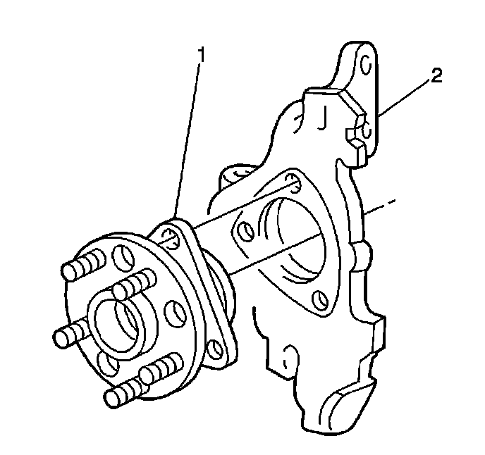 6. Remove the hub and bearing assembly (1) from the steering knuckle (2) and drive axle shaft.