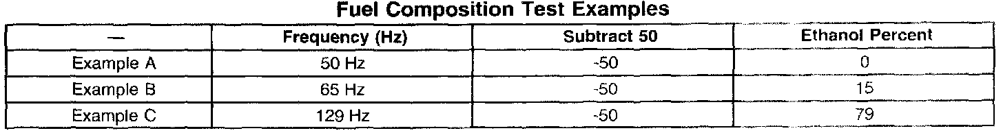 3. Subtract 50 from the reading on the DMM in order to obtain the percentage of alcohol in the fuel sample. Refer to the examples in the Fuel Composition Test Examples table.
