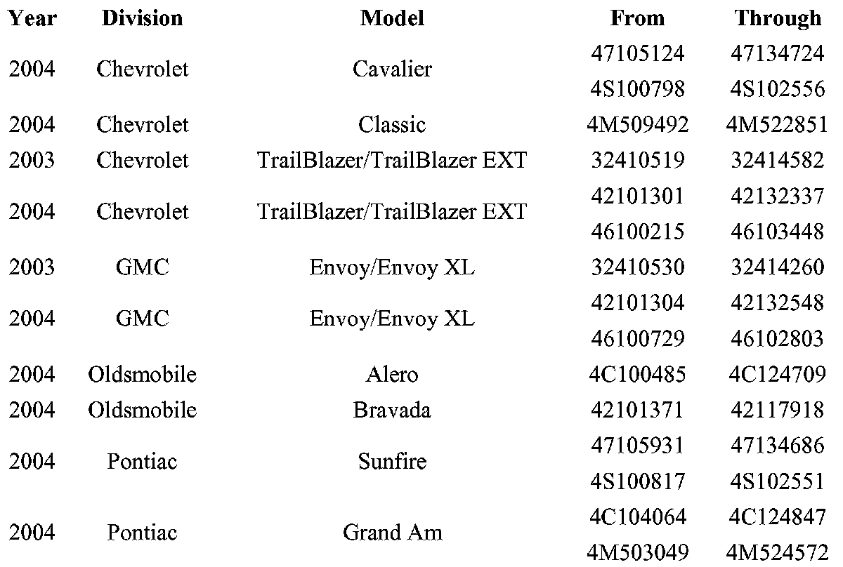 Involved are certain DEALER INVENTORY 2003 and 2004 model year Chevrolet TrailBlazer and TrailBlazer EXT, GMC Envoy and Envoy XL, and 2004 model year Oldsmobile Bravada vehicles equipped with a 4.2L L6 engine (LL8); and 2004 model year Chevrolet Cavalier and Classic, Oldsmobile Alero, and Pontiac Grand Am and Sunfire vehicles equipped with a 2.2L L4 engine (L61) and built within the VIN breakpoints shown.