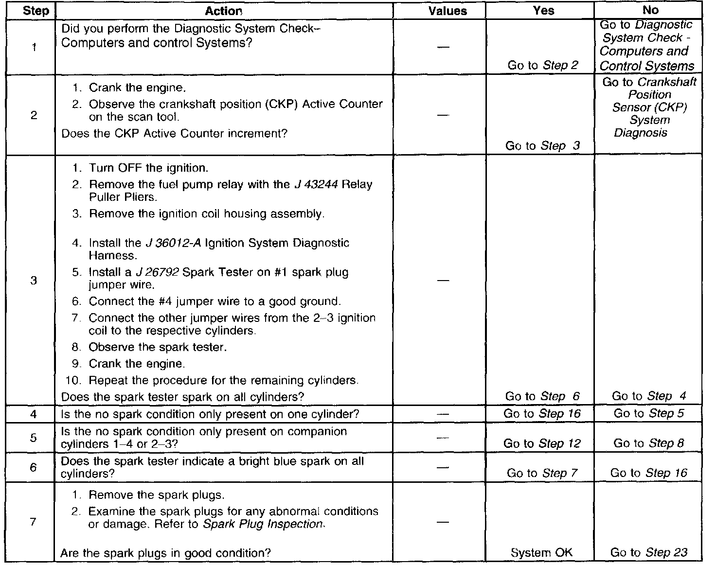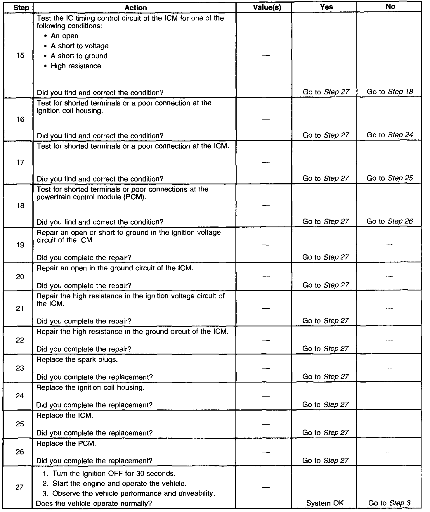 Each ignition coil supplies secondary voltage to a pair of spark plugs. This is called a waste spark ignition system. The powertrain control module (PCM) supplies a signal on each of the ignition control (IC) timing control circuits to the ignition control module (ICM). The ICM fires the correct ignition coil at the correct time based on the signals. The ICM detects if cylinder 1 or cylinder 3 is on the compression stroke by sensing the secondary voltage and polarity of each side of the ignition coil. The ICM detects this voltage with sensing circuitry integrated into each ignition coil. The higher voltage is on the compressing cylinder. This is called compression sense ignition. The ICM provides a synthesized cam signal to the PCM based on these inputs. The PCM uses the cam signal to synchronize fuel injection.