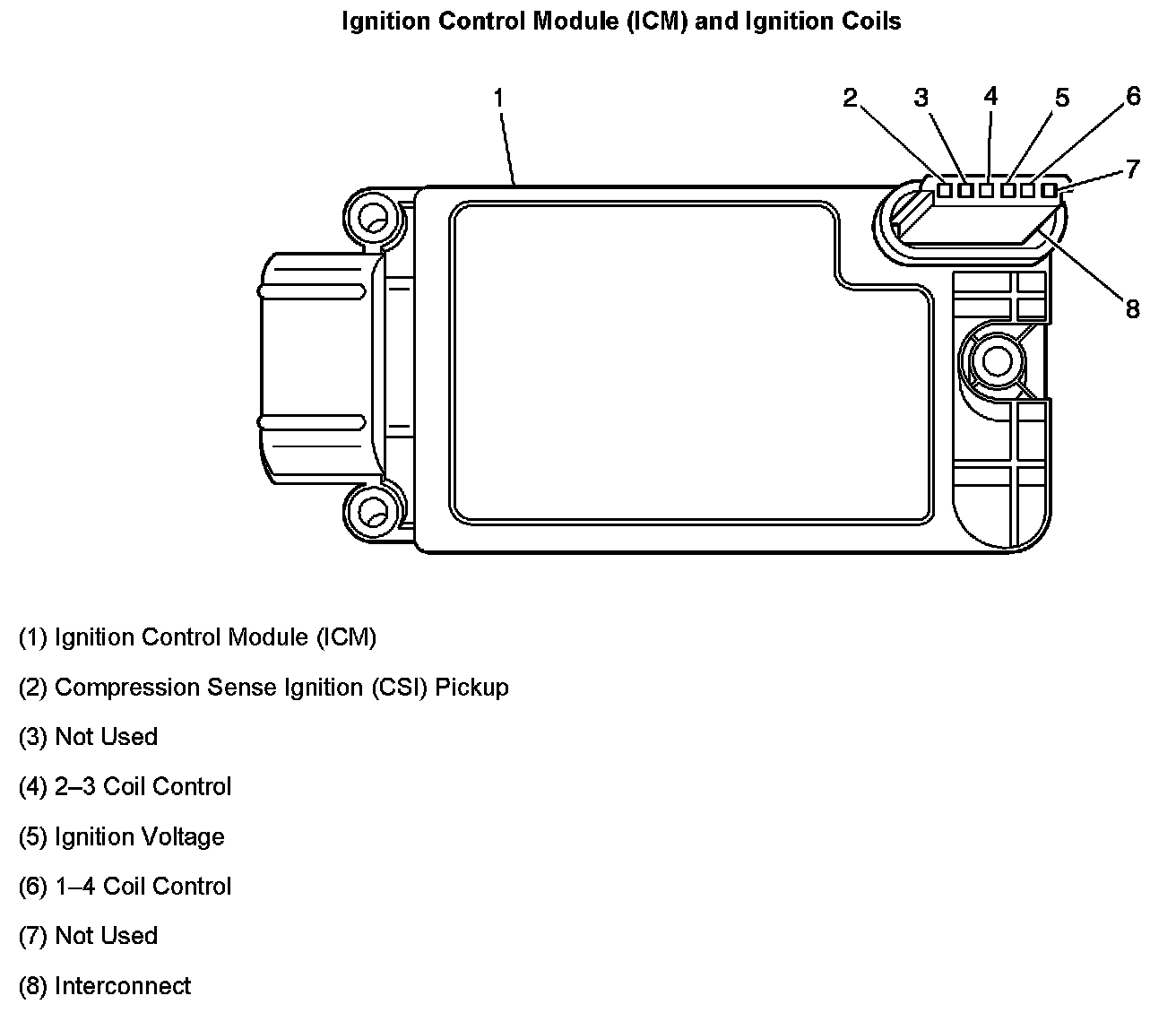 Each ignition coil is responsible for supplying secondary energy to a pair of spark plugs. The ignition control signals output by the PCM are amplified by the ICM in order to fire each coil. The spark events are triggered by the ICM, but the module has no influence on spark timing. The ICM is also responsible for detecting and supplying a camshaft position (CMP) signal pulse to the PCM to be used for sequential fuel injection. This ignition system does not use a conventional CMP sensor that detects valve train position. The ICM detects when either cylinder 1 or cylinder 3 has fired on the cylinders compression stroke using sensing circuitry integrated within each coil. The sensing circuit detects the polarity and the strength of the secondary voltage output, the higher output is always at the event cylinder. The ICM sends a CMP signal to the PCM based on the voltage difference between the event and waste cylinder firing energy.