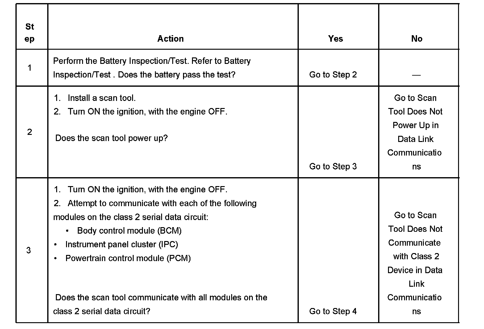 3. Lack of communication may be because of a partial malfunction of the class 2 serial data circuit or due to a total malfunction of the class 2 serial data circuit. The specified procedure will determine the particular condition.