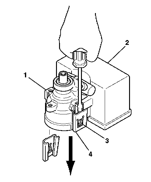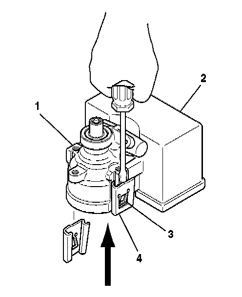 4. Slide the reservoir clip (4) away from the hydraulic pump assembly (1).