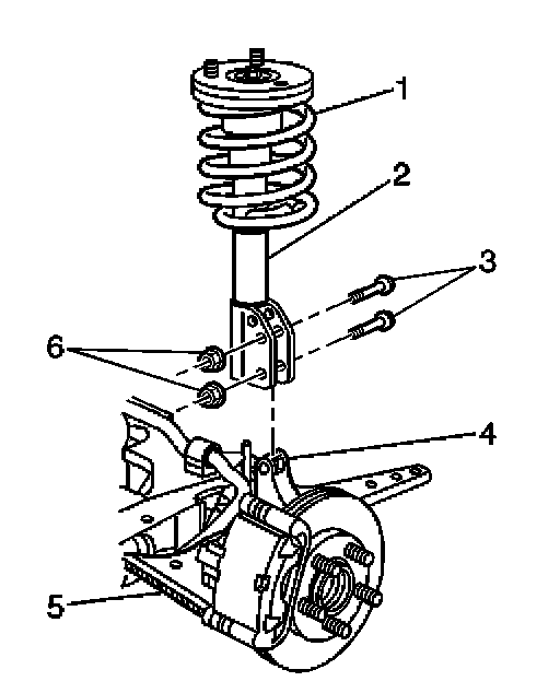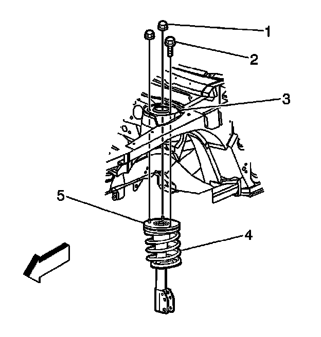1. Remove the nuts (1) and the bolt (2) attaching the top of the strut assembly (5) to the body (3).