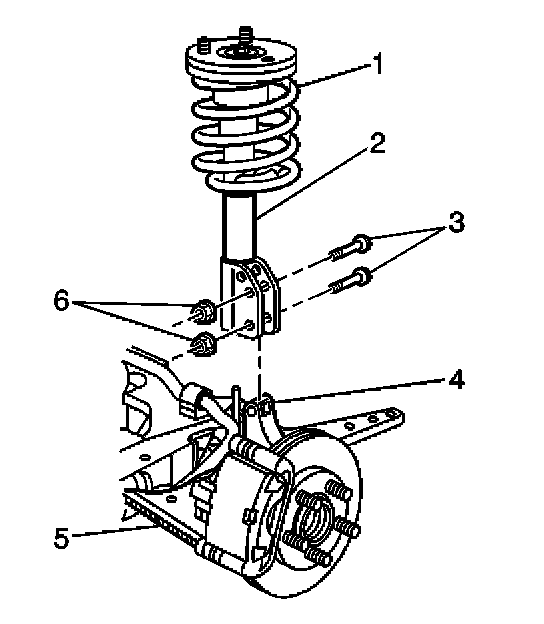 7. Remove the bolts (3) and the nuts (6) that attach the strut (2) to the steering knuckle (4).