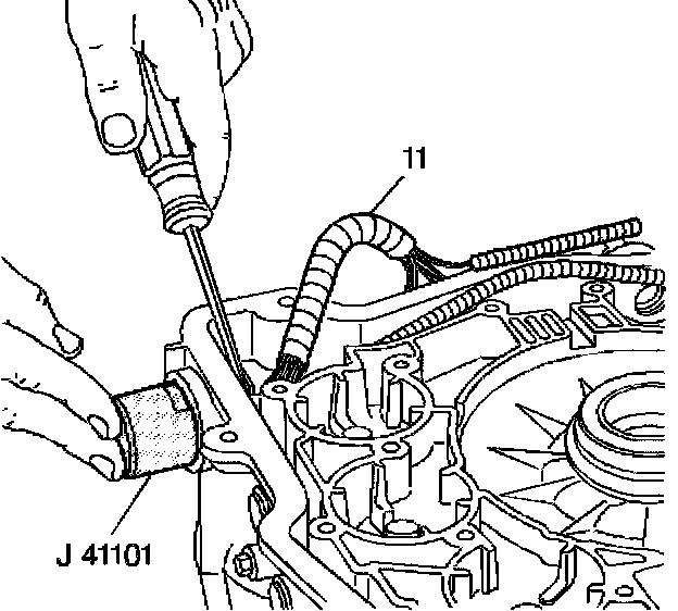 1. Push the J 41101 onto the pass-through connector from the outside of the transmission case in order to compress the pass-through connector's retaining tabs.