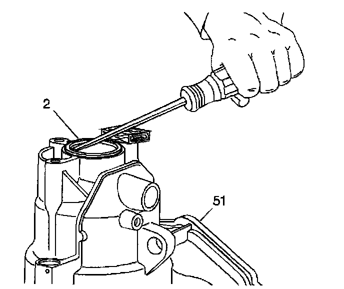 Important: Be careful not to damage the case bore with the screwdriver.Use a screwdriver in order to remove the right hand axle seal (2) from the transmission case (51). If necessary, crush the right hand axle seal first with the screwdriver in order to loosen the seal from the case.