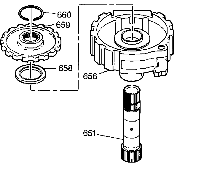 6. Remove the forward clutch support (656) from the final drive sun gear shaft (651).