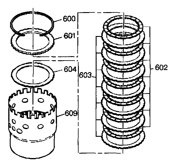 8. Install the seven steel plates (603) and the seven new fiber plates (602) in alternating order beginning with a steel plate (603).