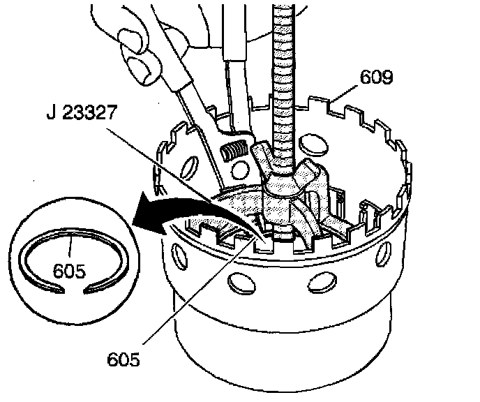 5. Assemble the snap ring (605) in order to retain the forward clutch return spring.