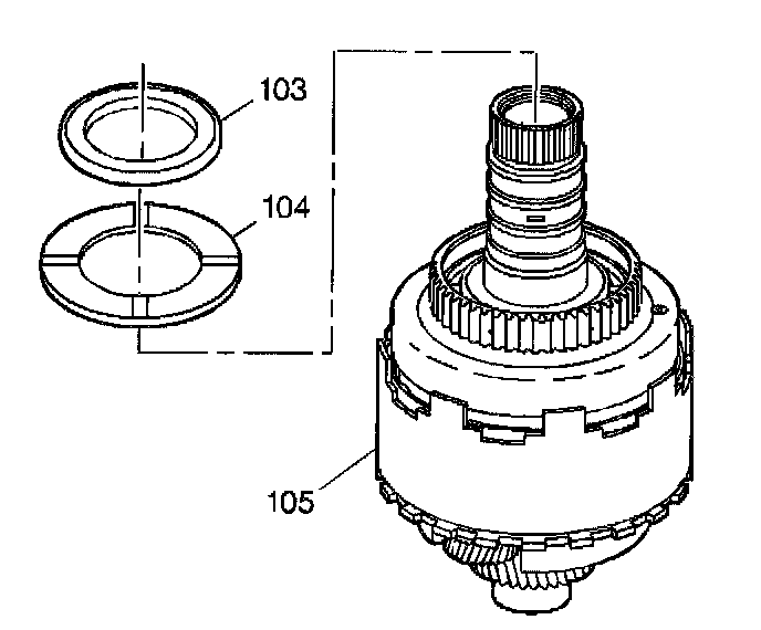 1. Remove the selective thrust bearing (103) and the thrust washer (104) from the input shaft of the direct and coast clutch assembly (105).
