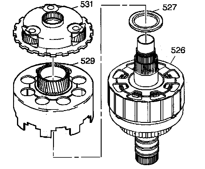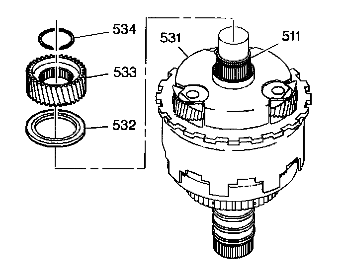 5. Remove the reaction carrier assembly (531). You will find a thrust bearing permanently installed in the reaction carrier assembly under the pinion gears.