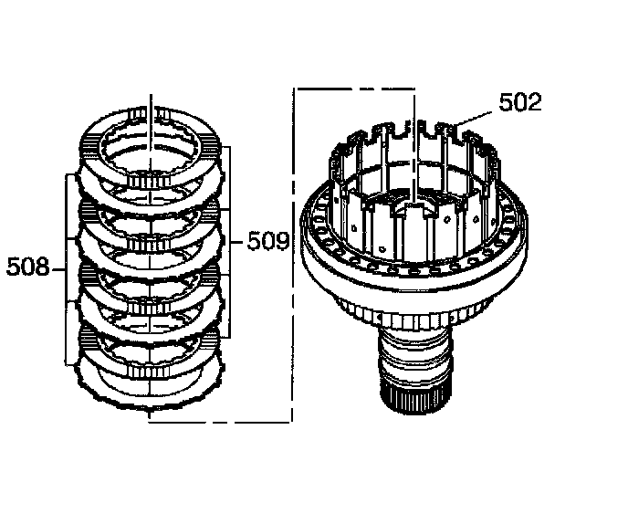 14. Remove the coast clutch plates from the input housing (502). The coast clutch consists of four steel plates (508) and four fiber plates (509).