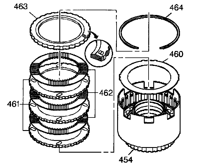 2. Remove the reverse clutch plates (one backing plate (463), three steel plates (461), three fiber plates (462), and a waved plate (460).