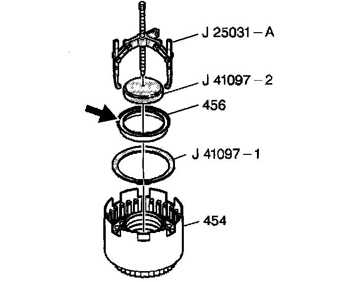 9.1. Use the J 4646 or equivalent in order to install the J 41097-1 under the outer lip of the reverse clutch inner seal (456).