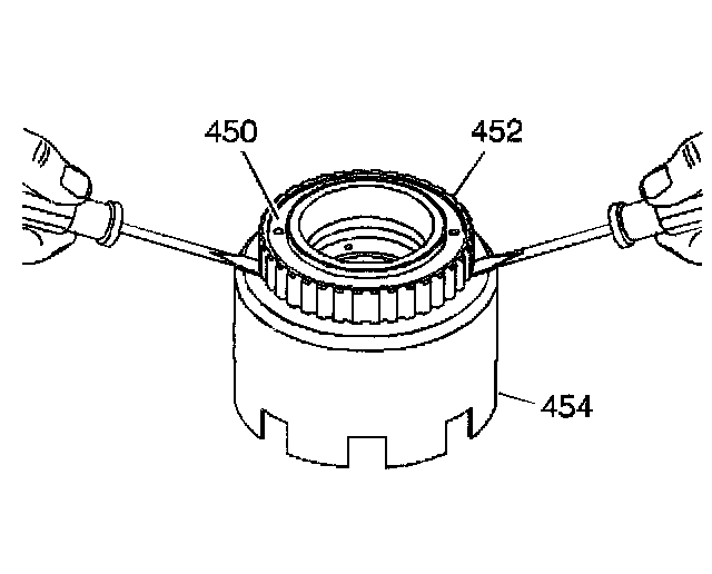 10. Remove the 2nd roller clutch (452) and roller clutch retainer (450) by prying up on the roller clutch assembly with two screwdrivers. The second roller clutch retainer is pressed onto the reverse clutch housing (454) and is not reusable after removal.