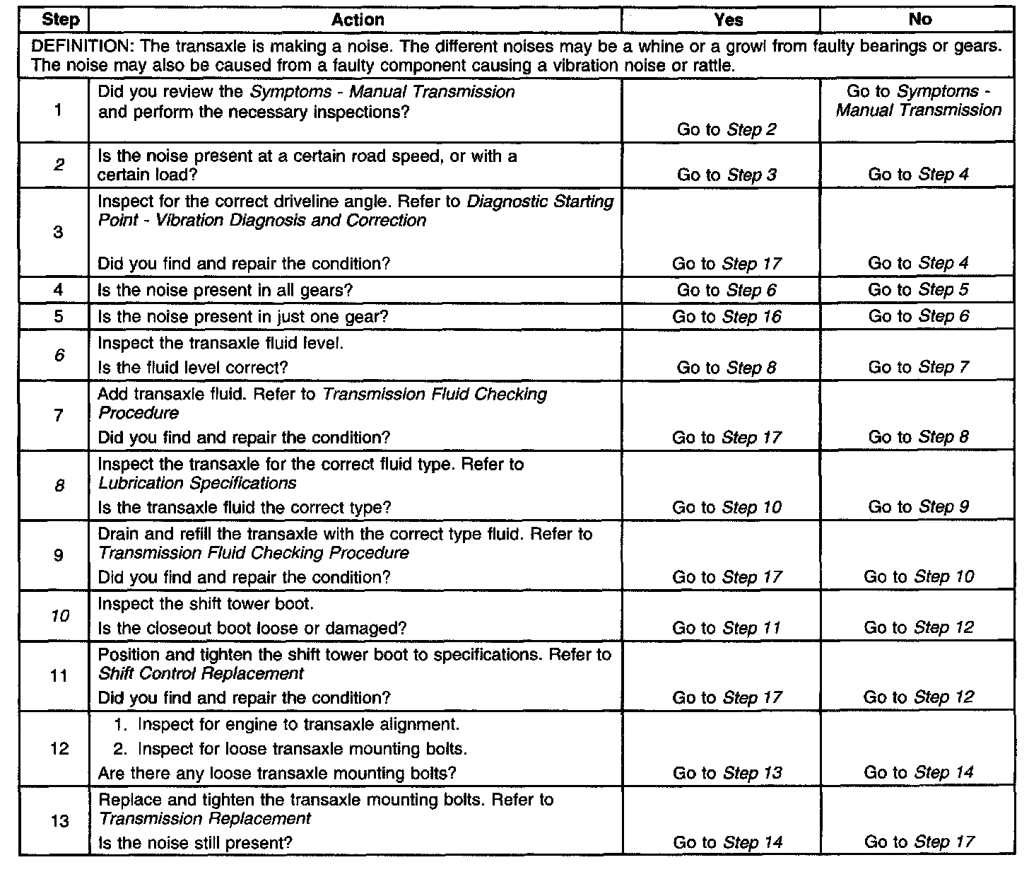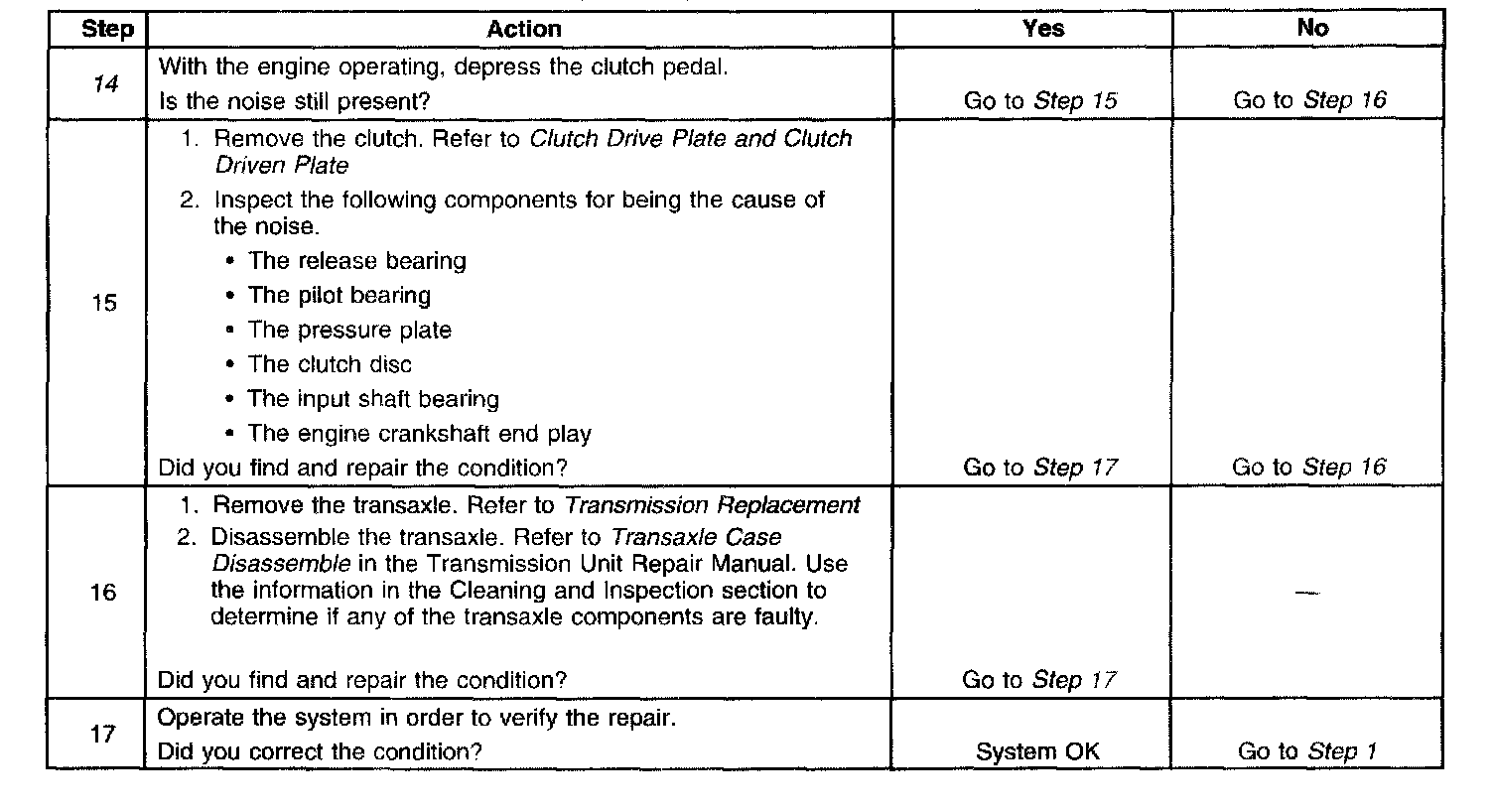 14. This step tests to determine if clutch components are making the noise. Depress the clutch pedal slowly and listen for the change in noise. If the noise changes while pressing the pedal, it may be a faulty clutch component. If the noise does not change until the clutch is completely disengaged, the transaxle component is faulty.