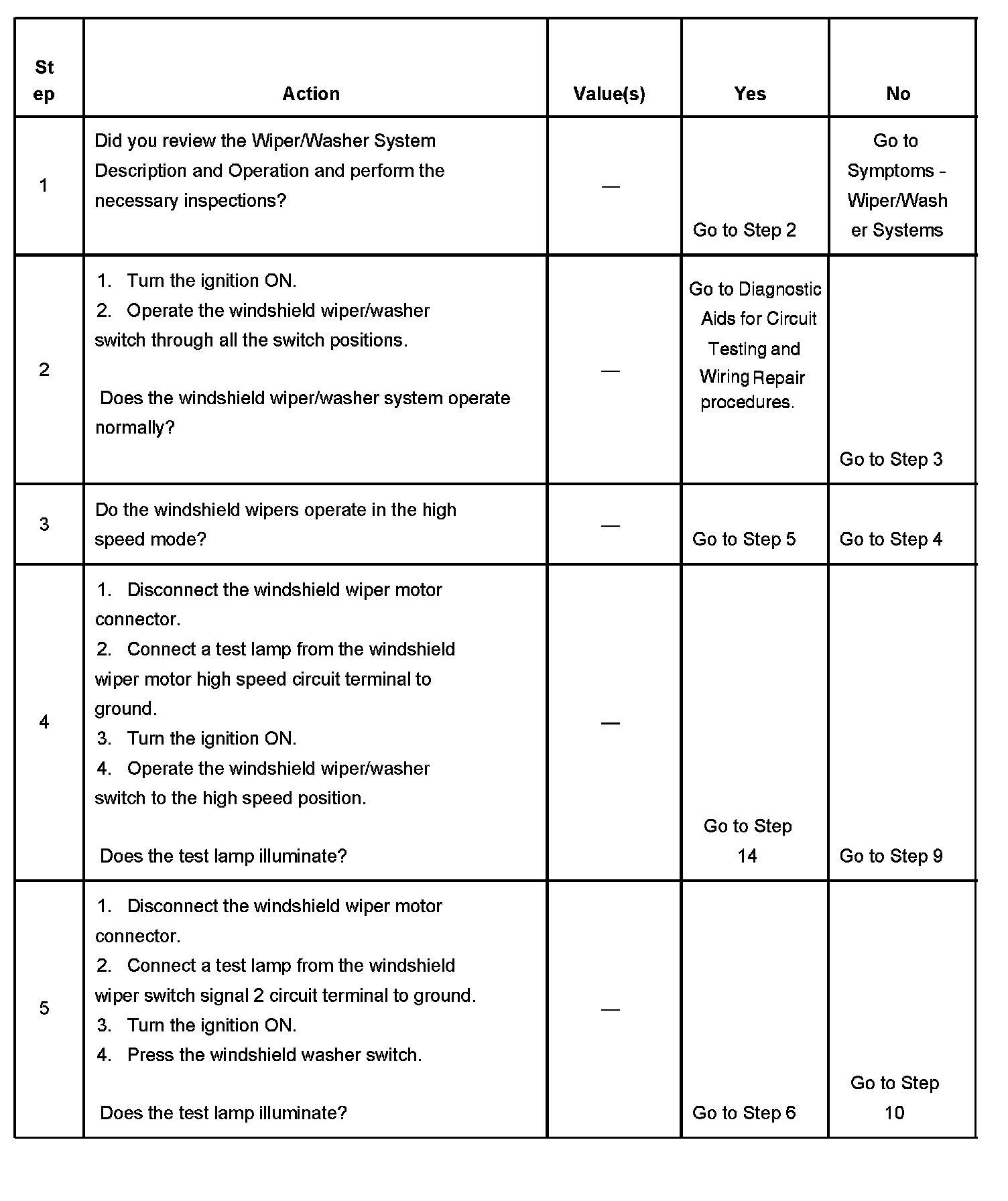 The numbers below refer to the step numbers on the diagnostic table.