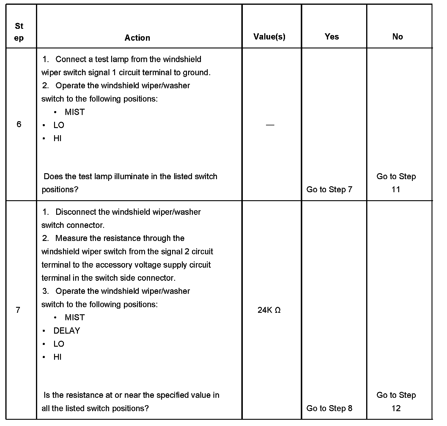 7. This step tests for continuity through the 24K Ohms. resistor in the windshield wiper/washer switch. The connector behind the instrument panel knee bolster is suitable for performing this step.