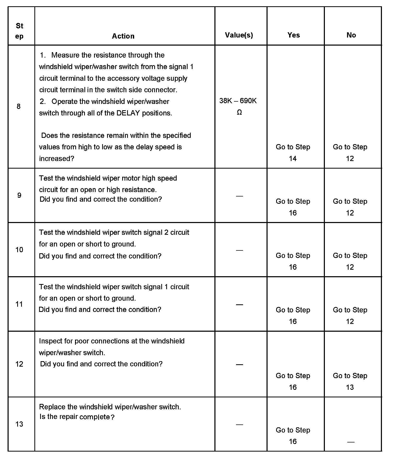 8. This step tests for continuity through the delay resistors in the windshield wiper/washer switch. The measured resistance will change in sequence from high to low as the delay speed is increased. The connector behind the instrument panel knee bolster is suitable for performing this step.