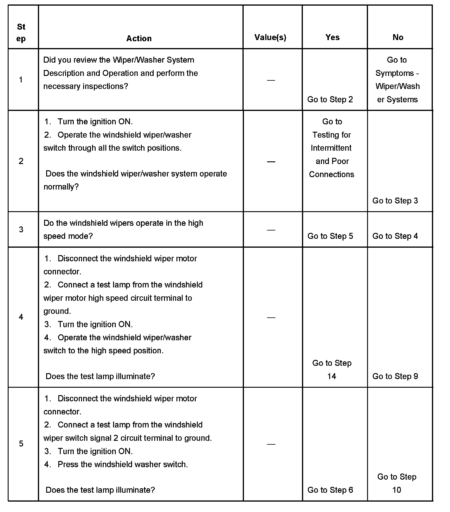 The numbers below refer to the step numbers on the diagnostic table.