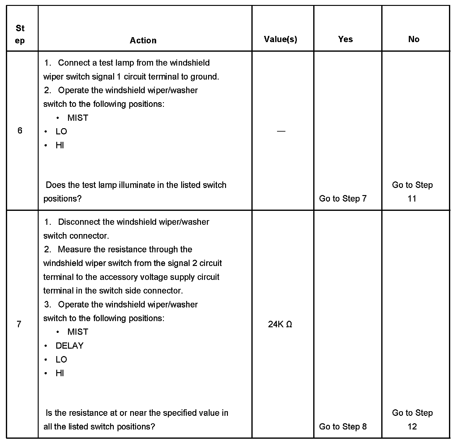 7. This step tests for continuity through the 24K Ohm resistor in the windshield wiper/washer switch. The connector behind the instrument panel knee bolster is suitable for performing this step.