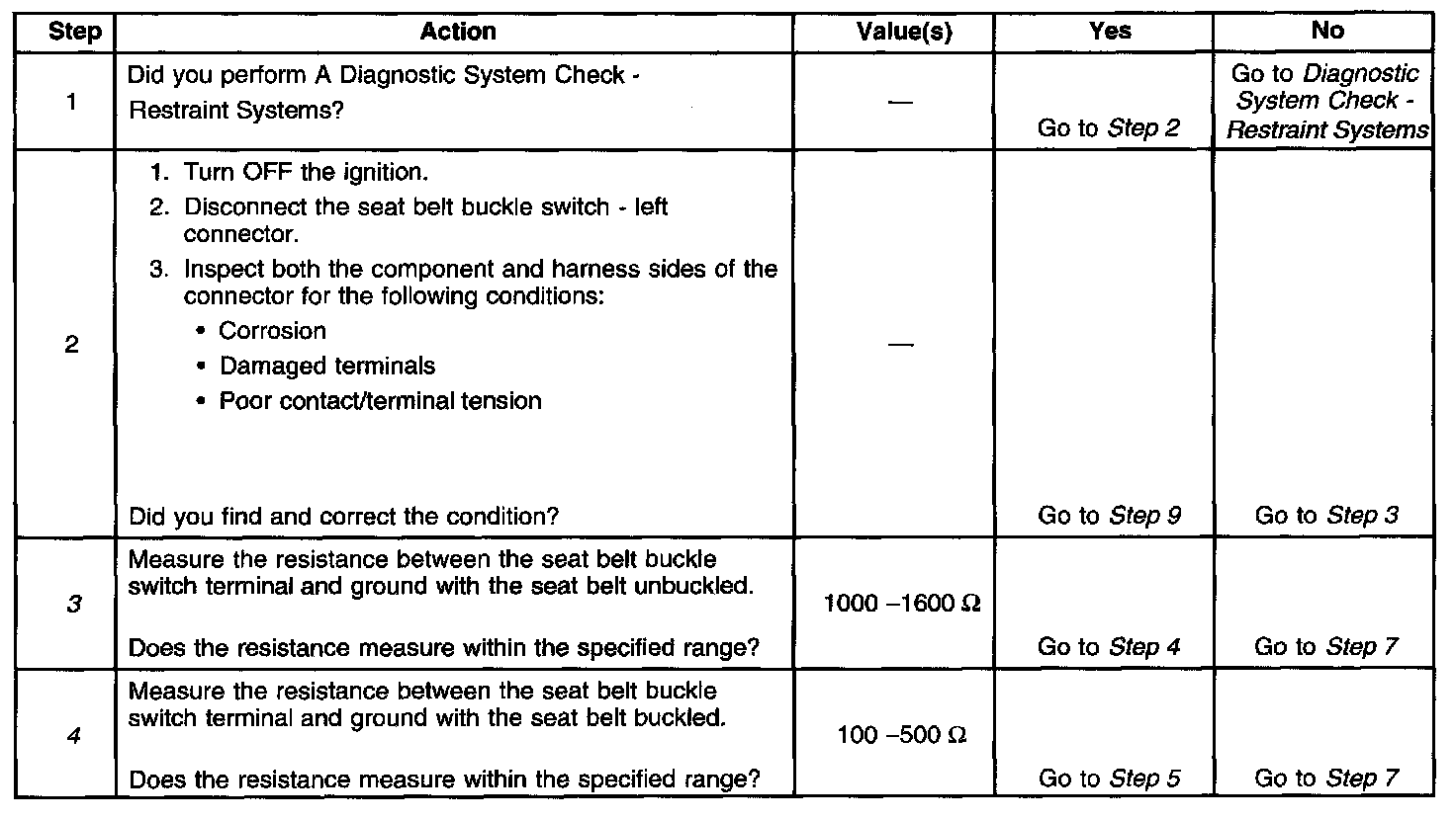 4. Tests the seat belt buckle switch (buckled) for the proper resistance value.