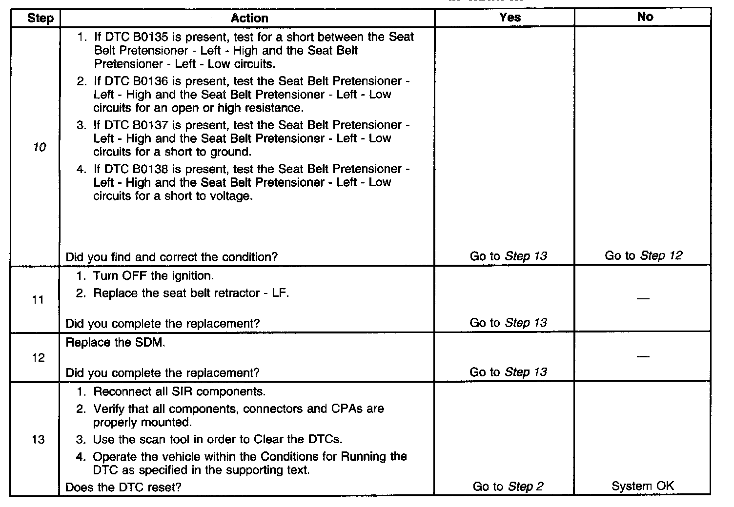 - DTC B0135 will set when the SDM detects a low resistance condition in the Seat Belt Pretensioner - LF deployment loop.