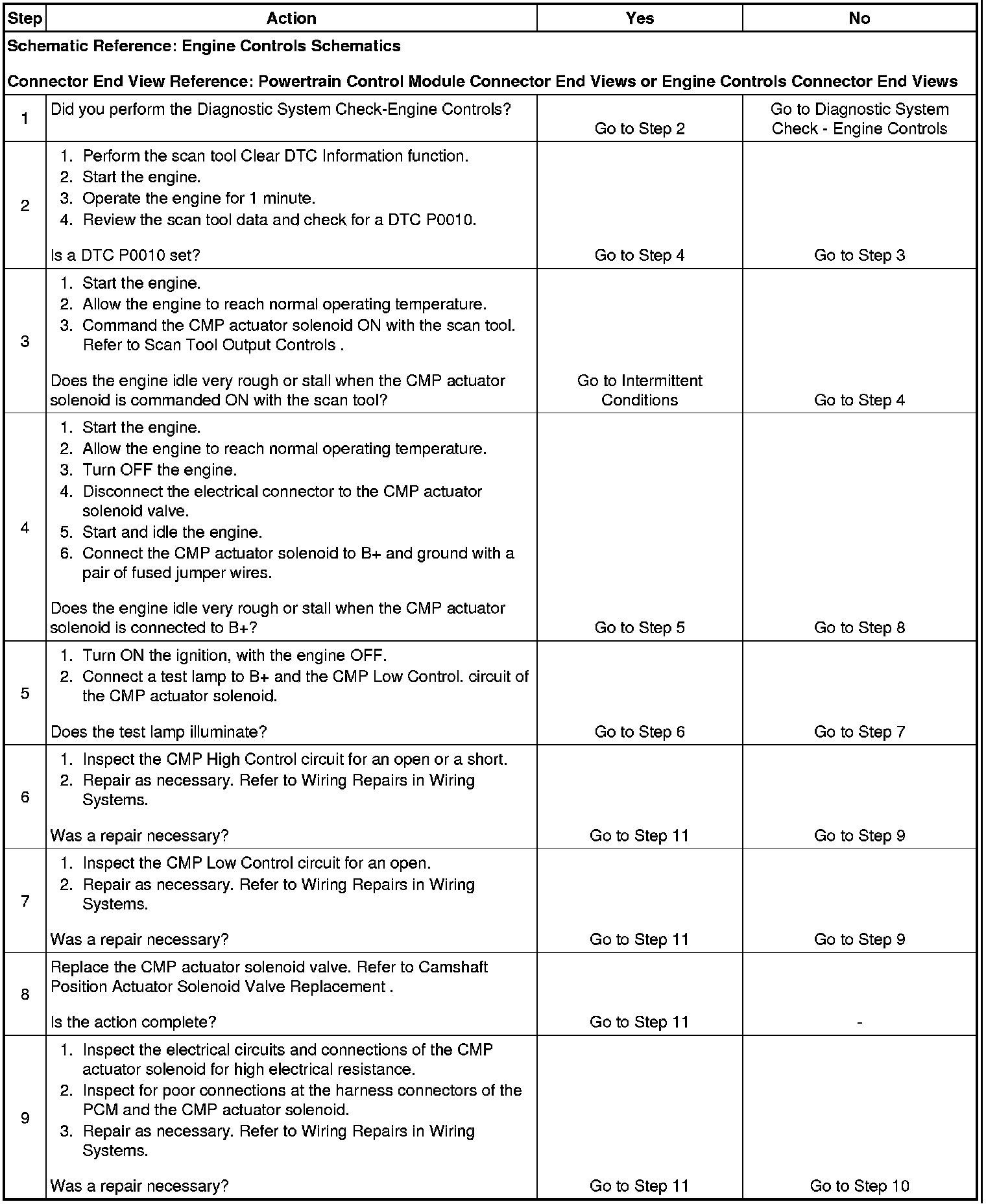 9. This step checks for electrical resistance in the wiring and connections of the CMP actuator solenoid circuit. Circuit resistance as small as 25 ohms can cause a DTC P0010 to set.