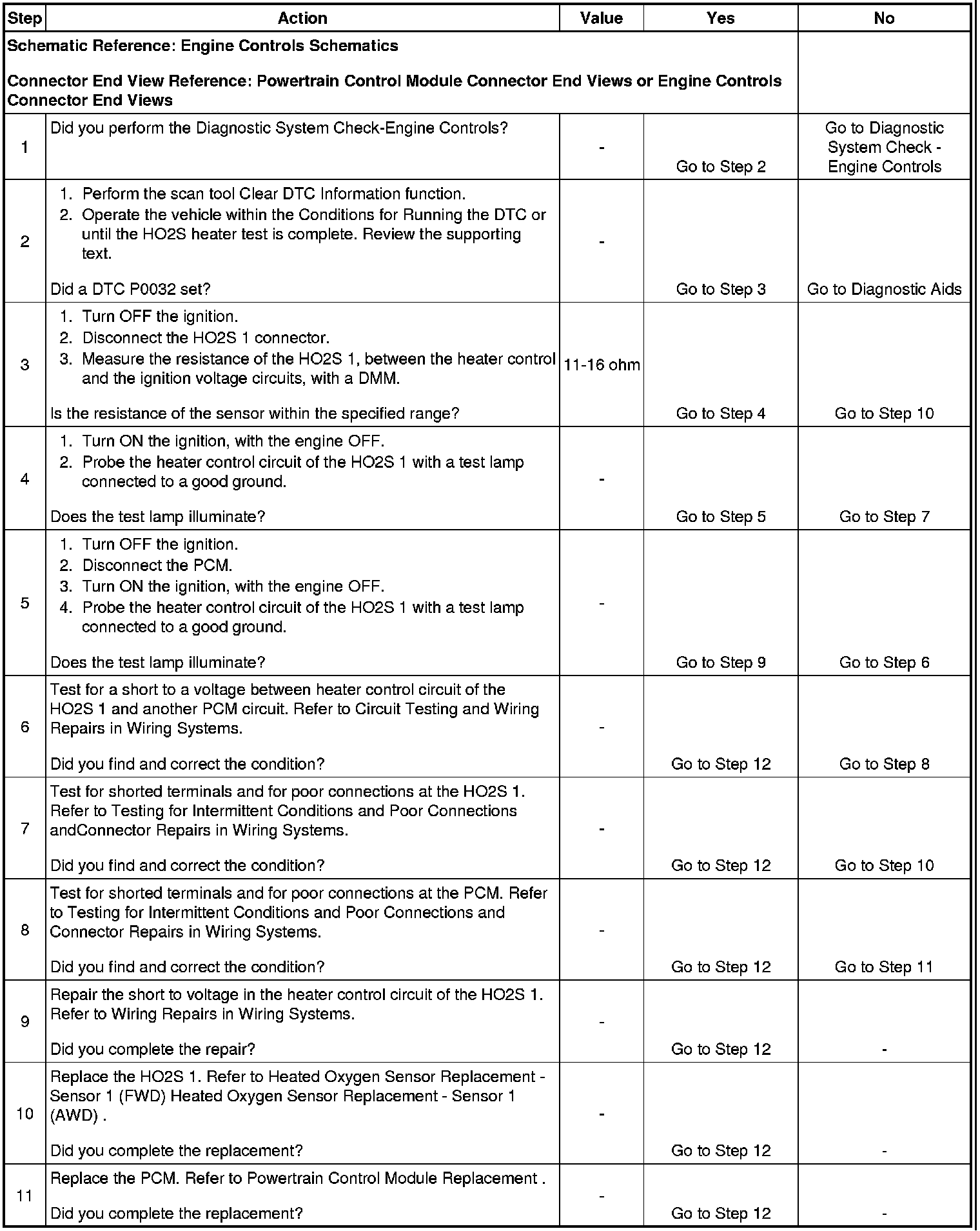 * The HO2S heater diagnostic checks for many of the faults that can cause DTC P0032 to set. If the HO2S heater test passes, the cause of the DTC is probably intermittent. Clear the DTC information. Road test the vehicle while monitoring the HO2S heater test in the I/M System Information selection on the scan tool. When the HO2S heater test indicates complete with a YES status, check for a DTC P0032 under Last Test Failed. If there is no DTC P0032 indicated, the DTC is intermittent and the HO2S heater diagnostic is indicating OK at this time.