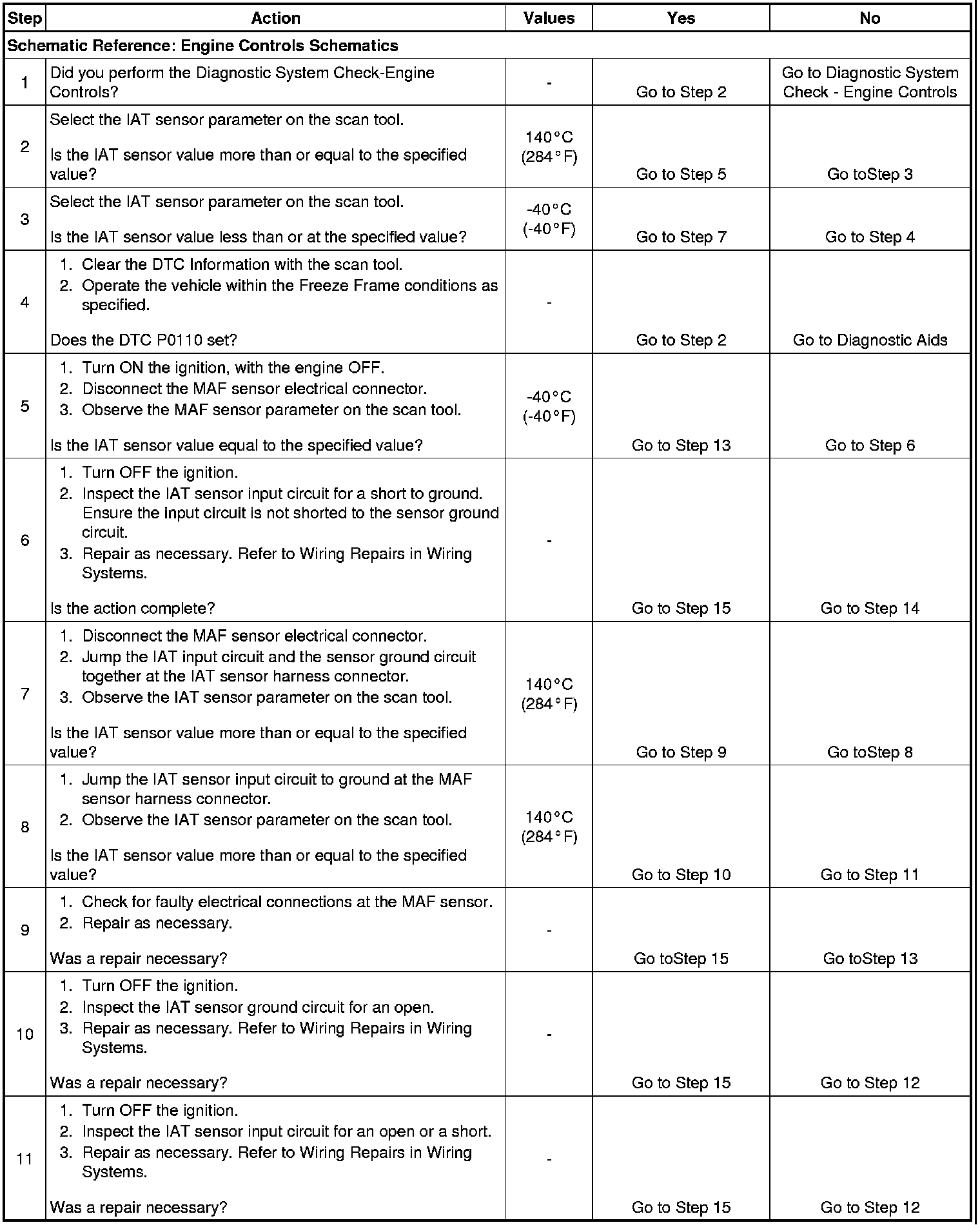 Use the Temperature vs Resistance table in order to evaluate the possibility of a shifted IAT sensor. A shifted sensor could result in a DTC P0110. Refer to Temperature Versus Resistance (Electrical Specifications).