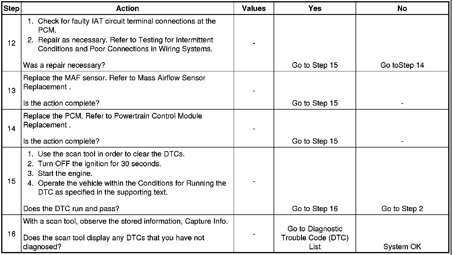 An intermittent malfunction may be caused by a fault in the IAT sensor electrical circuit. Inspect the wiring harness and the components for an intermittent condition. Refer to Intermittent Conditions (Intermittent Conditions).