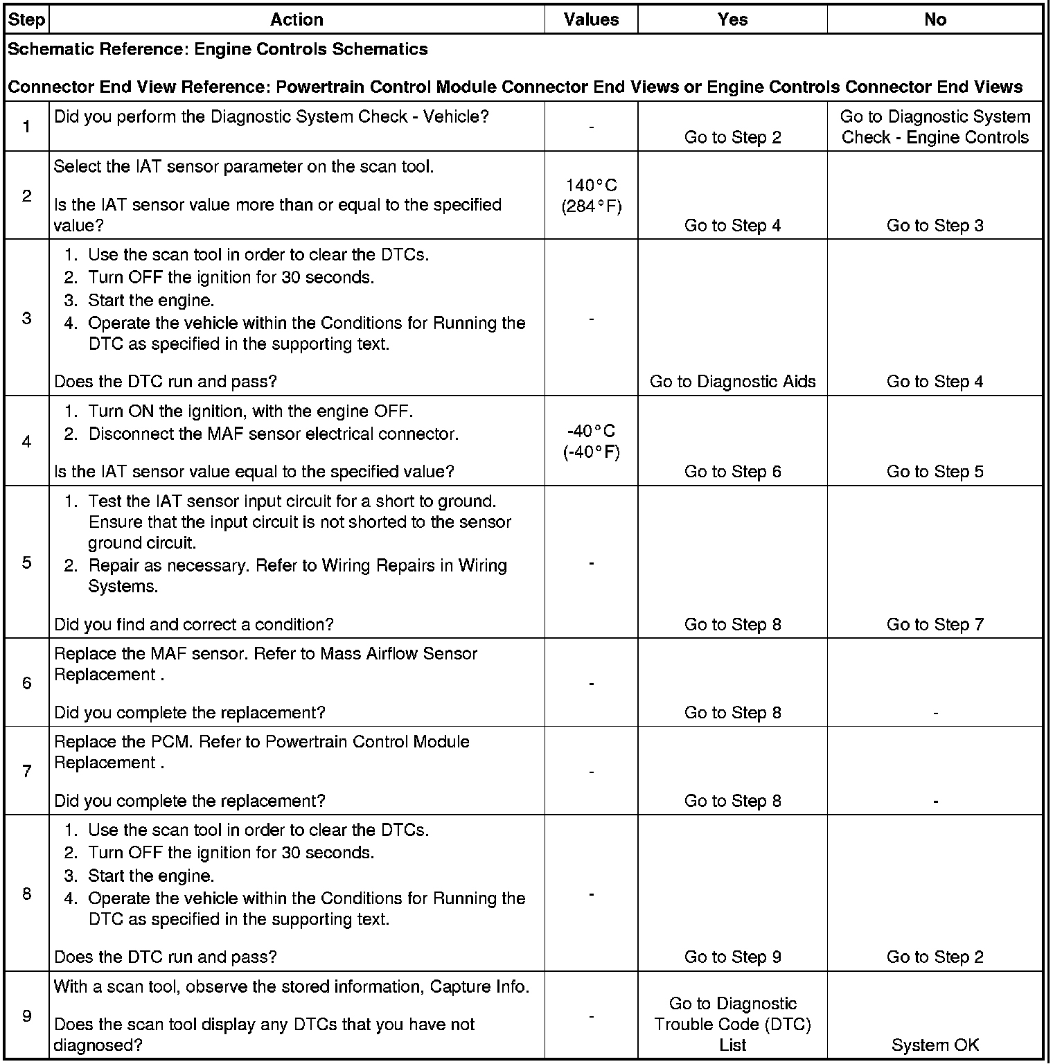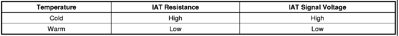 Use the Temperature vs Resistance table in order to evaluate the possibility of a shifted IAT sensor. A shifted sensor could result in a DTC P0112. Refer to Temperature Versus Resistance (Electrical Specifications).