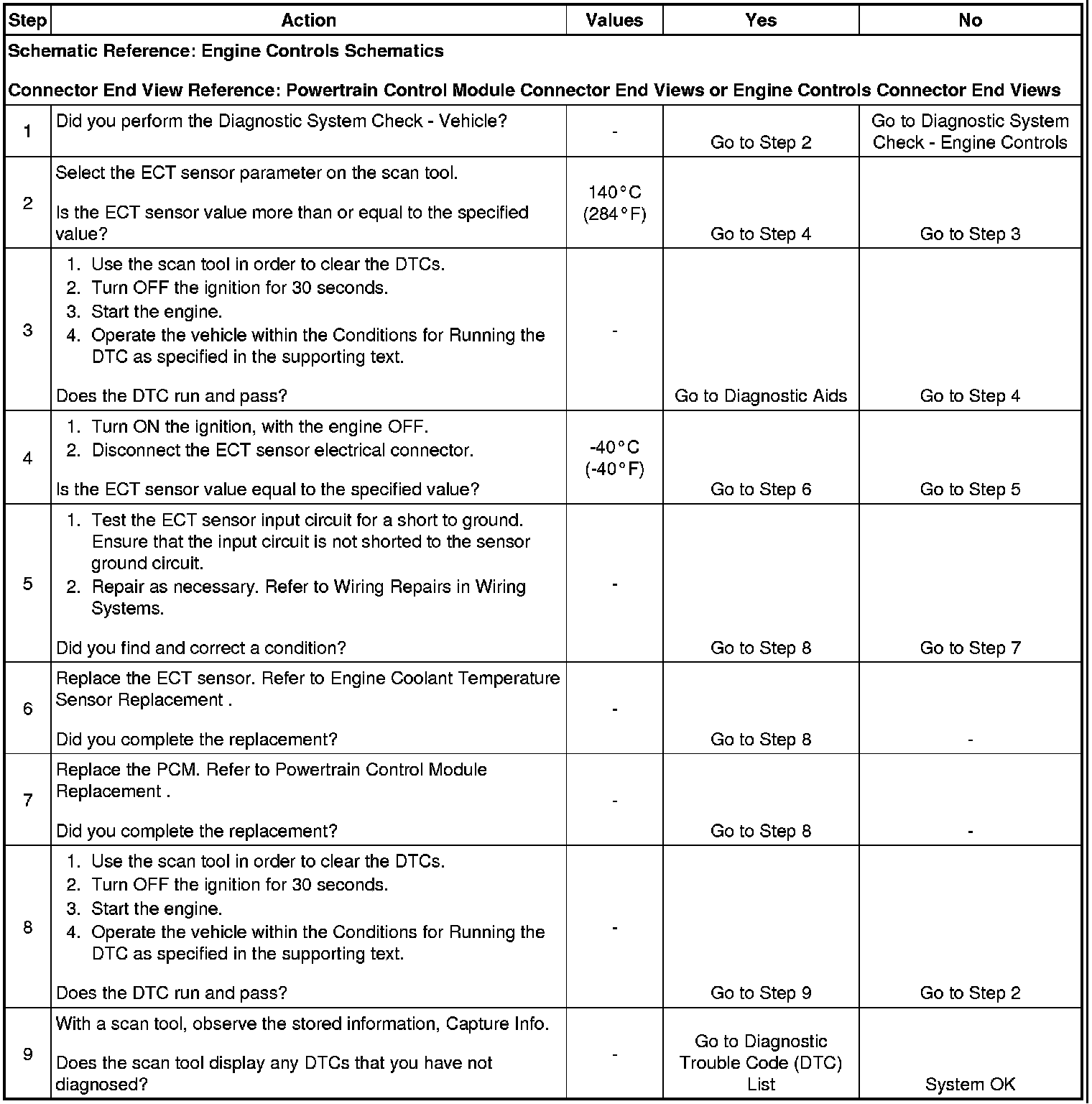 * Use the Temperature vs Resistance table in order to evaluate the possibility of a shifted ECT sensor. A shifted sensor could result in a DTC P0117. Refer to Temperature Versus Resistance (Electrical Specifications).