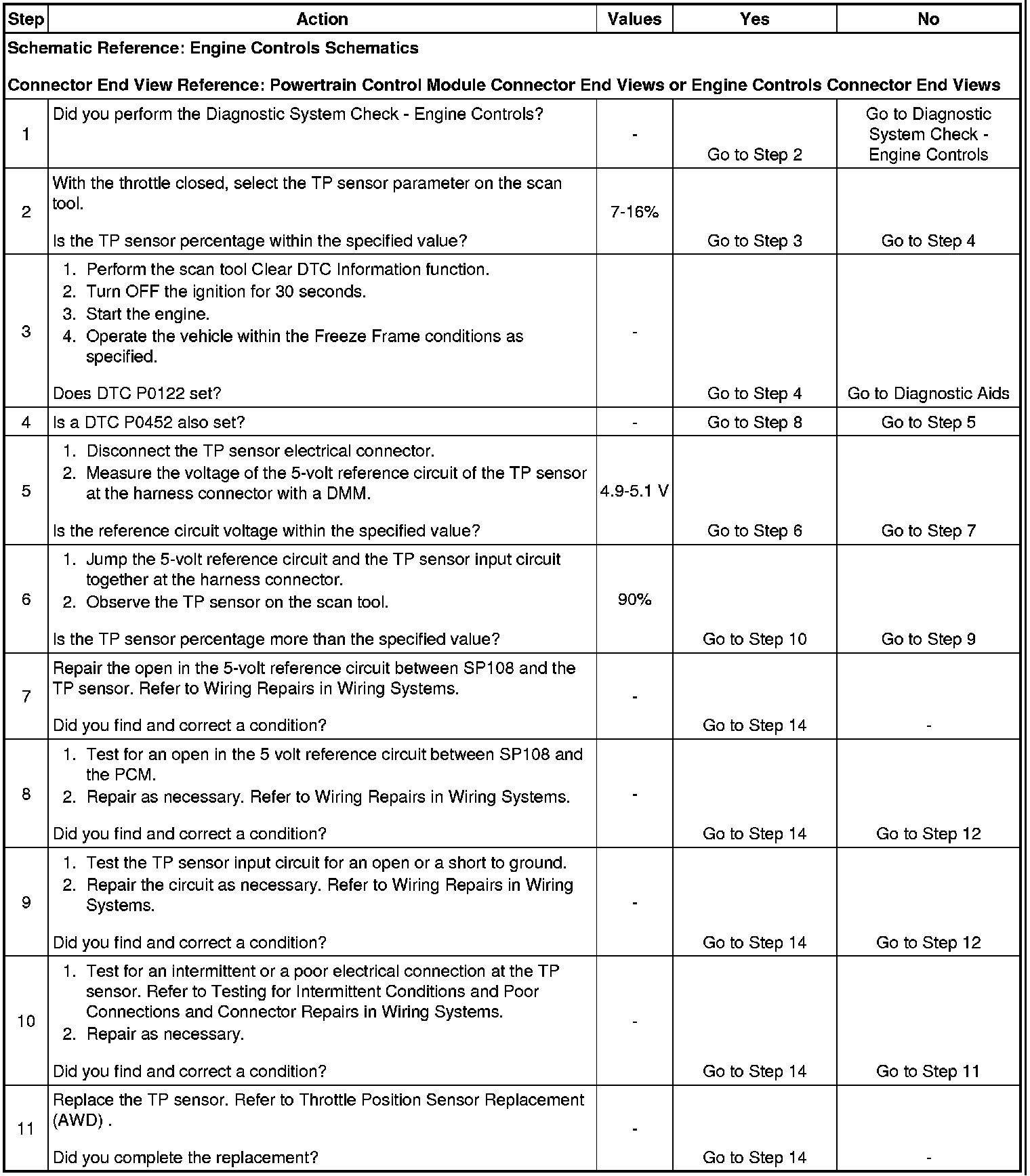 The DTC P0122 Throttle Position (TP) Sensor Circuit Low Voltage diagnostic detects an out of range sensor signal. The TP sensor is a potentiometer whose resistance value changes along with the throttle valve position. The powertrain control module (PCM) provides a 5-volt reference voltage to the TP sensor. The PCM reads the voltage across the TP sensor and uses the voltage to calculate the percentage of throttle valve opening. The TP sensor resistance decreases as the throttle valve opening increases. When the TP sensor resistance decreases the voltage being monitored by the PCM increases. The TP sensor resistance increases when the throttle valve opening decreases, therefore the voltage being monitored by the PCM will decrease.