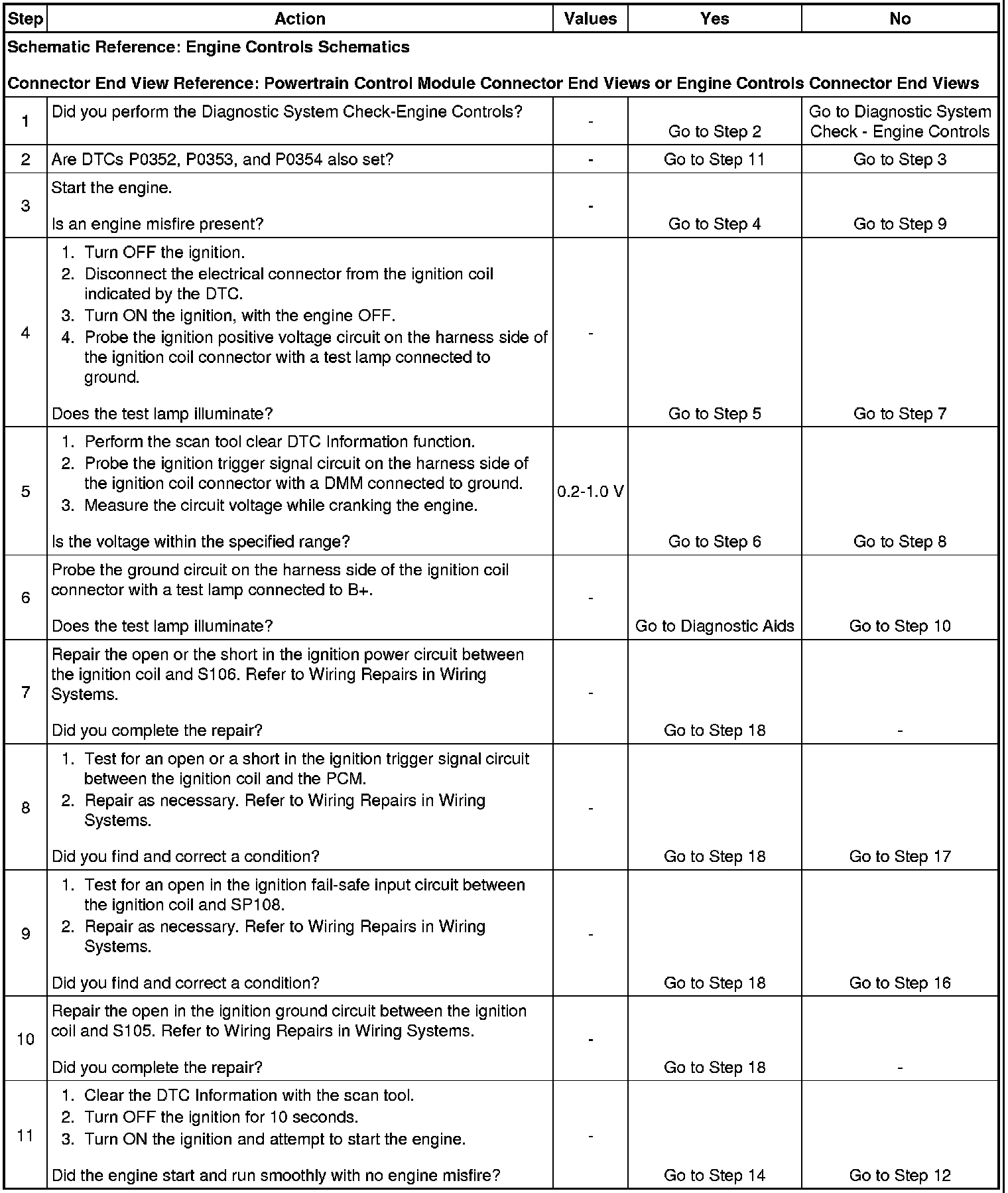 - If DTCs P0352, P0353, and P0354 are present, the fault is located in the shared electrical circuits or shared components of the ignition coils.